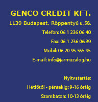 A Genco Credit Zálogház, komoly pénzügyi háttérrel és régmúlt tapasztalattal rendelkezõ cég. Cégünk más pénzügyi-gazdasági társaságokkal karöltve azért alakult, hogy bármely típusú jármûvére (autó, haszongépjármû, motor, agrárgép, vízi jármû) azonnali készpénzt biztosítson.